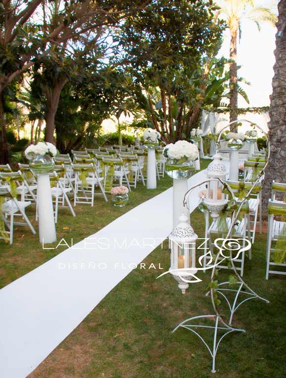 El color blanco predominante en la alfombra, los jarrones de cristal del pasillo, la madera de las sillas y el tul realizaba un contraste de luz con el verde del césped y la lazada de las sillas.