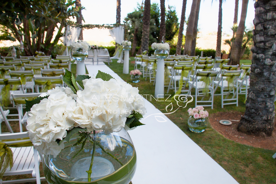 La ceremonia la realizaron en los jardines del impresionante Hotel Envía Almería Wellness & Golf Cinco Estrellas, os dejo el enlace por si queréis ver sus impresionantes instalaciones. Desde la primera entrevista con ellos, empezamos a diseñar una ceremonia elegante con un toque romántico, que se integrara en perfecta armonía con el jardín y las preciosas vistas al campo de golf de La Envía.